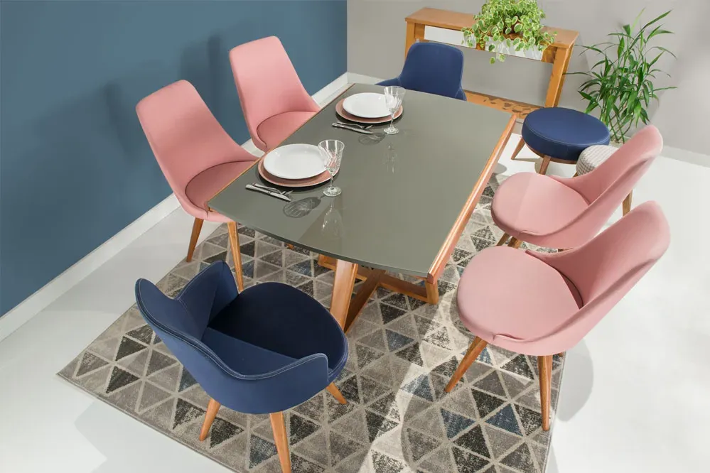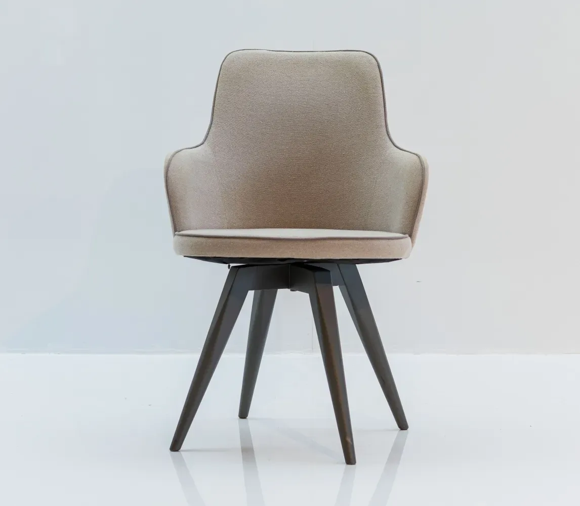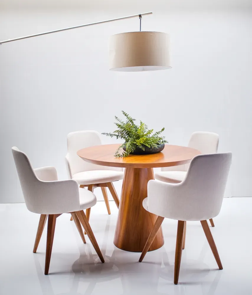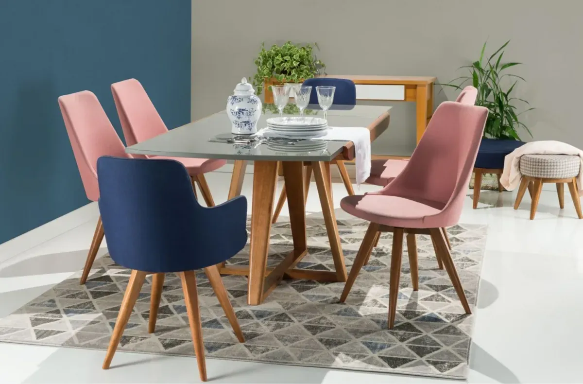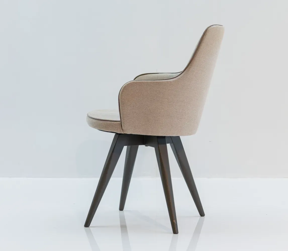 Seu sistema fixo ou giratório, produzido em aço e nylon, facilita a movimentação em ambientes para home office, por exemplo. Assento e encosto estofados com espumas de boa densidade, está presente em tecido delicado, de alto padrão. Com curvas suaves, sua estrutura mostra cada detalhes da cadeira confeccionada em madeira maciça de eucalipto reflorestada com acabamento em verniz PU personalizado.