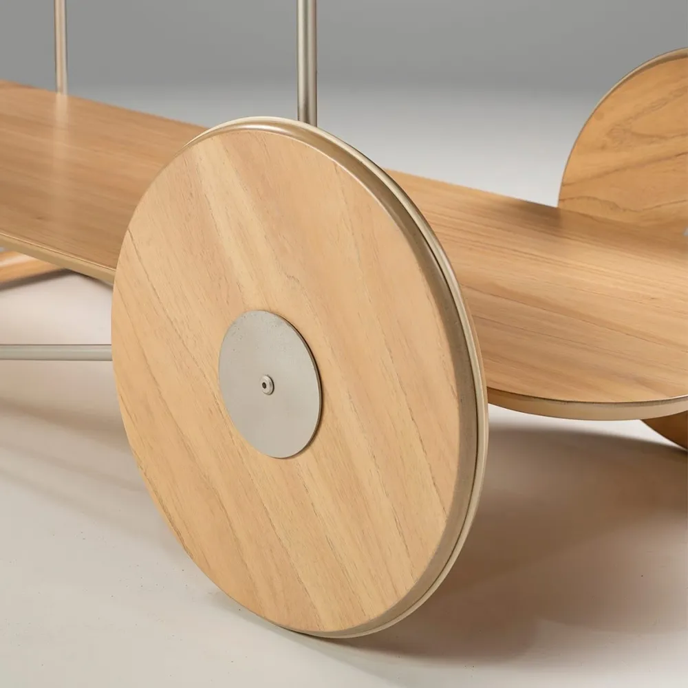 Delicado e versátil, sua estrutura é fabricada em aço carbono com pintura automotiva. Suas rodas dianteiras são fixas, compondo a estrutura da peça.